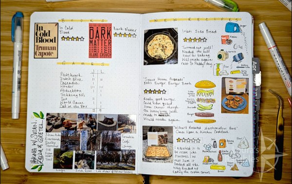 The second spread of all my monthly wrap ups is for tracking books read, game scores, new recipes tried, and any extra pictures I want to include. Again add some ratings and write ups. I love doodling and also started doodling the ingredients for each recipe.