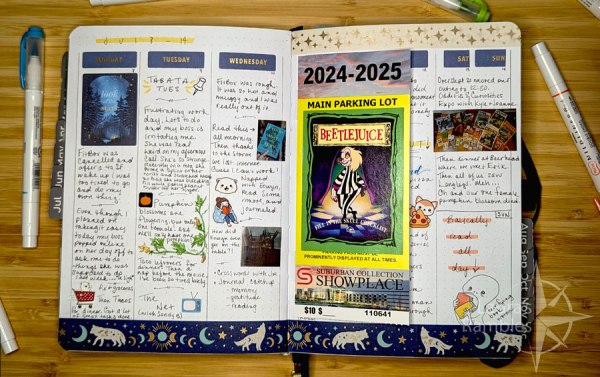 Keep tickets or playing cards to paste into your journal. Here I kept the parking ticket from the Expo we went to and pasted in a Beetlejuice playing card I bought while there.